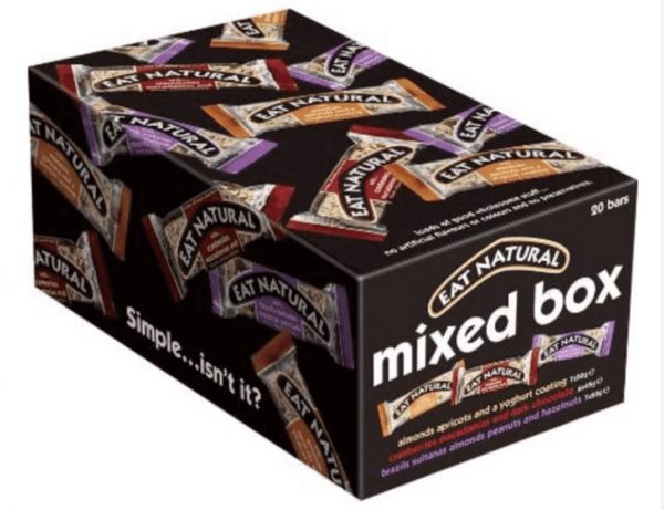 Box of delicious mix of Cereal bars containing Brazil & Sultana, Almond & Apricot and Dark Chocolate, toasted muesli and granola ideal for a snack or lunch box.