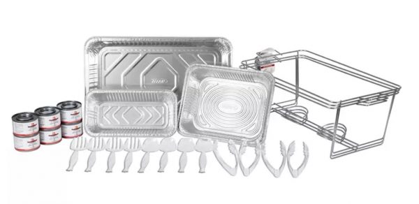 There are 3 chrome racks which can hold a mix of 3 heavy-duty aluminium full steam water pans, 4 heavy-duty aluminium half steam food pans, and 3 heavy-duty aluminium one-third steam food pans. There are 6 ethanol gel-heat cans. Each has a 2.5-hour burn time. They keep your food hot throughout the catering period. There are 4 sets of spoons, forks, and tongs. They are suitable for all your catering dishes.
