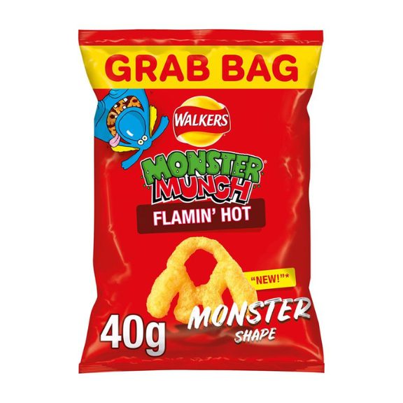 Deliciously spicy Walkers Monster Munch Flamin Hot flavour snacks. Grab Bag perfect for break time, lunch time or party time. Crunchy, tasty and totally spooky, Monster Munch are a family favorite. Baked not fried and contain no artifical colours – suitable for vegetarians