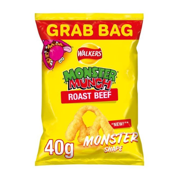 Deliciously meaty Walkers Monster Munch Roast Beef flavour snacks. Grab Bag perfect for break time, lunch time or party time. Crunchy, tasty and totally spooky, Monster Munch are a family favorite. Baked not fried and contain no artifical colours – suitable for vegetarians